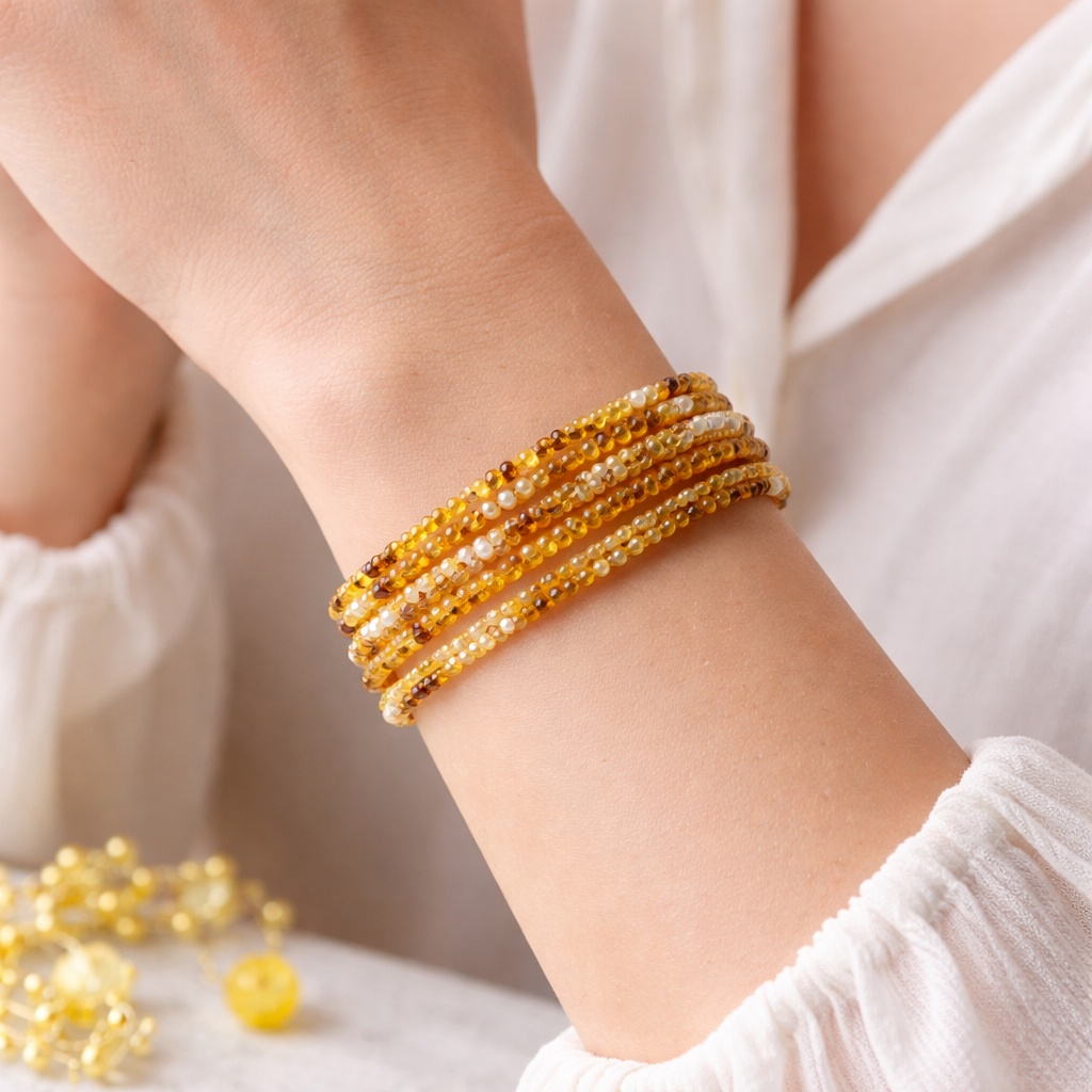 Je vytvořený z kvalitních korálků od českého výrobce, laděný do teplých slunečních odstínů.